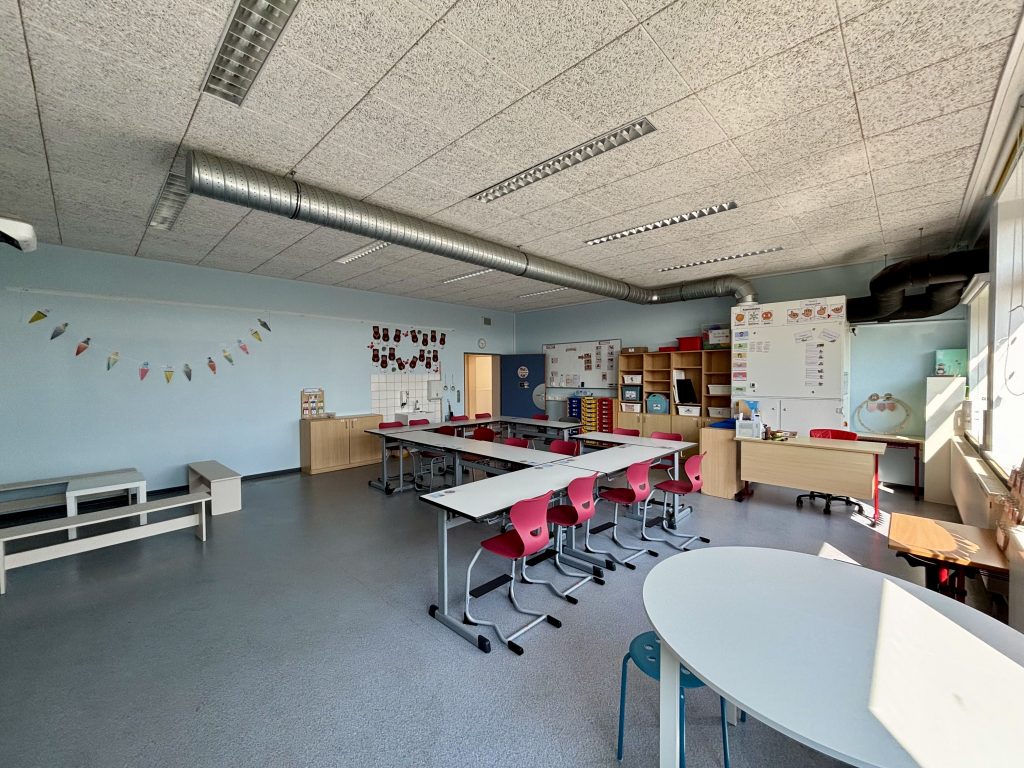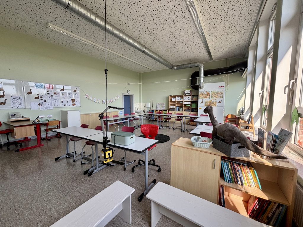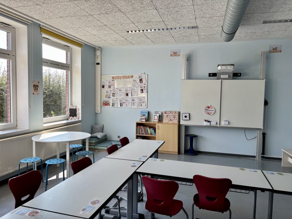 Neben modernen Tischen und Stühlen finden sich hier auch digitale Tafeln und Lernstationen, an denen die Schülerinnen und Schüler selbstständig oder in kleinen Gruppen arbeiten können. Unser Ziel ist es, den Unterricht abwechslungsreich zu gestalten – mit Projekten, kreativen Aufgaben und Bewegungspausen. So entstehen Neugier, Motivation und Freude am Lernen, die die Kinder ein Leben lang begleiten.