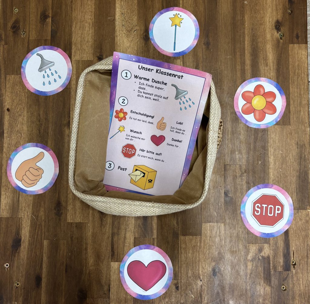 Im Klassenrat übernehmen die Kinder viele Aufgaben selbst: Sie melden Anliegen an, hören einander zu, führen Gespräche, stimmen ab und suchen gemeinsam nach Lösungen. So werden demokratische Grundprinzipien kindgerecht eingeübt – respektvoll, offen und mit Blick auf das Wohl der ganzen Klasse.