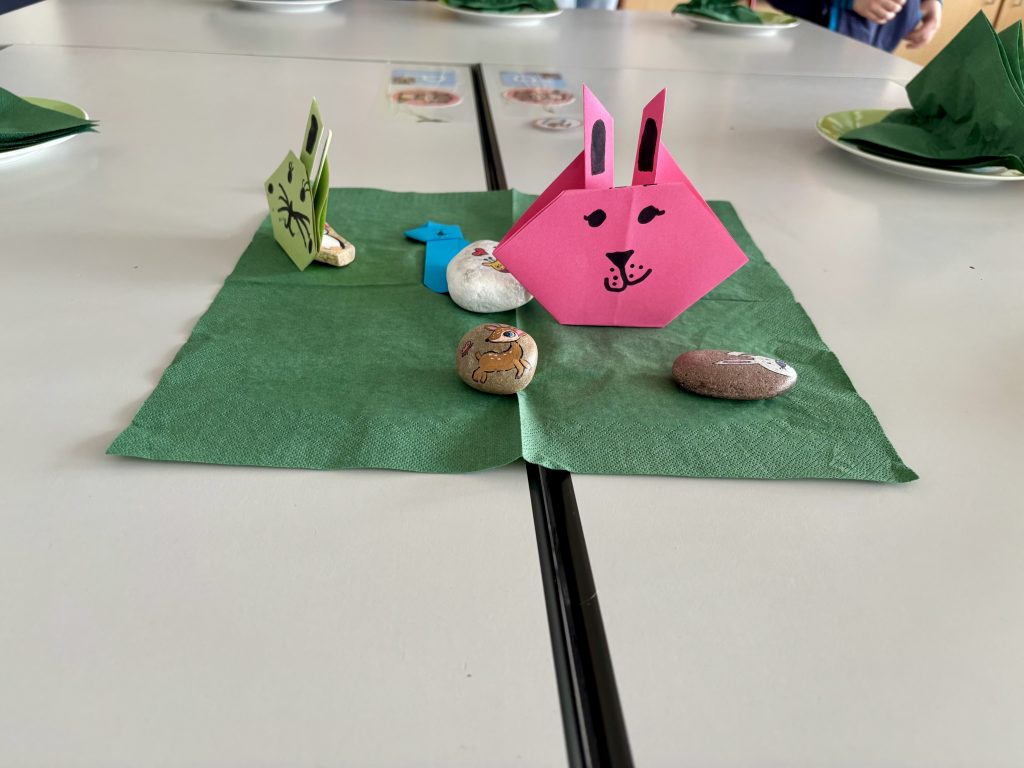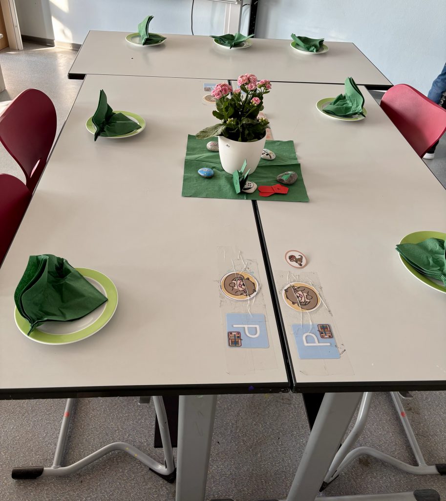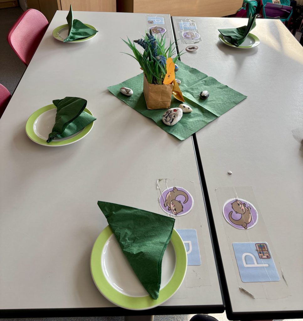 Neben der Vorbereitung des Frühstücks haben andere Kinder mit viel Sorgfalt die Räume zum Essen dekoriert, die Tische gedeckt, nach dem Frühstück abgewischt und auch das Geschirr gespült. So wurde die grüne Pause zu einem Gemeinschaftsprojekt, bei dem viele helfende Hände zum Gelingen beigetragen haben.