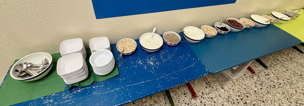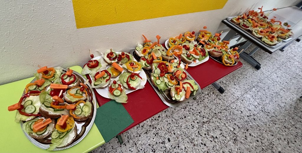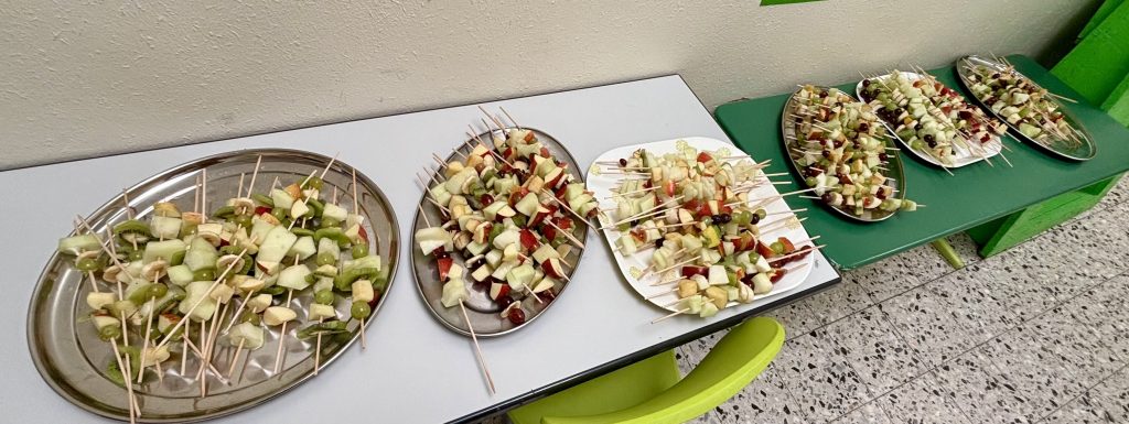 Mit großer Begeisterung wurden Gemüseschiffchen, Obstspieße sowie die Körnerecke mit Joghurt, Sonnenblumenkernen, Rosinen und weiteren gesunden Zutaten vorbereitet. Die Kinder haben die Speisen selbst zubereitet und für die gesamte Schule angerichtet. Der magische Zaubertee durfte natürlich auch nicht fehlen. Dabei konnten sie ganz praktisch erfahren, wie abwechslungsreich und lecker gesunde Ernährung sein kann.