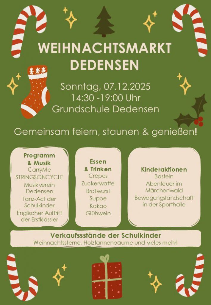 Am Sonntag, den 07. Dezember 2025, öffnet die Grundschule Dedensen von 14:30 bis 19:00 Uhr die Türen für ihren stimmungsvollen Weihnachtsmarkt. Unter dem Motto „Gemeinsam feiern, staunen & genießen“ erwartet unsere Gäste ein fröhlicher und festlicher Nachmittag für die ganze Familie.